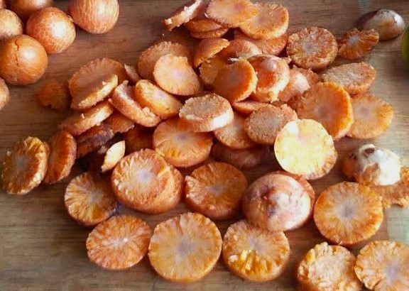 adalah biji pinang kering yang diiris melintang membentuk potongan bulat pipih menyerupai koin. Proses pengirisan ini dilakukan secara manual atau menggunakan mesin untuk menghasilkan potongan yang seragam dan bersih.