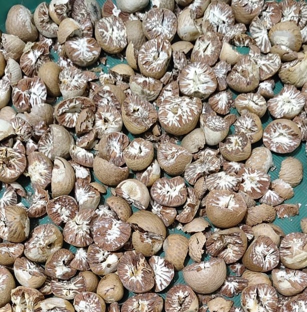 adalah hasil olahan dari buah pinang (Areca catechu) yang telah dipanen, dipisahkan dari kulitnya, lalu dikeringkan secara alami atau melalui proses oven hingga kadar air rendah. Produk ini memiliki warna coklat muda hingga coklat tua, dengan tekstur padat dan aroma khas.